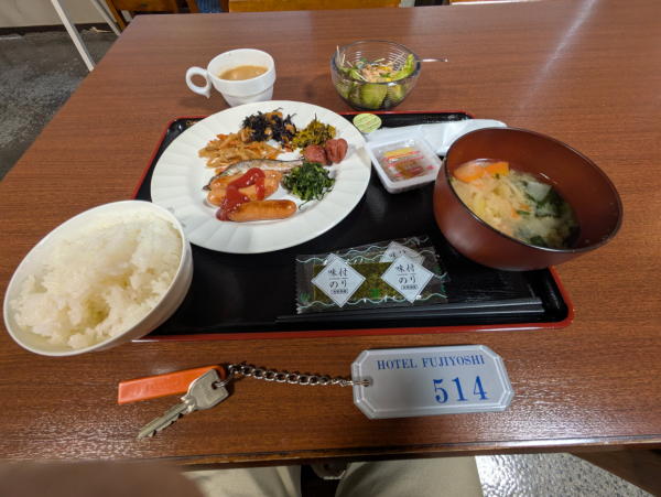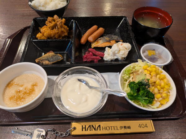 16日の朝食です。左側のお皿は、とろろ芋です。完全な食べすぎです。